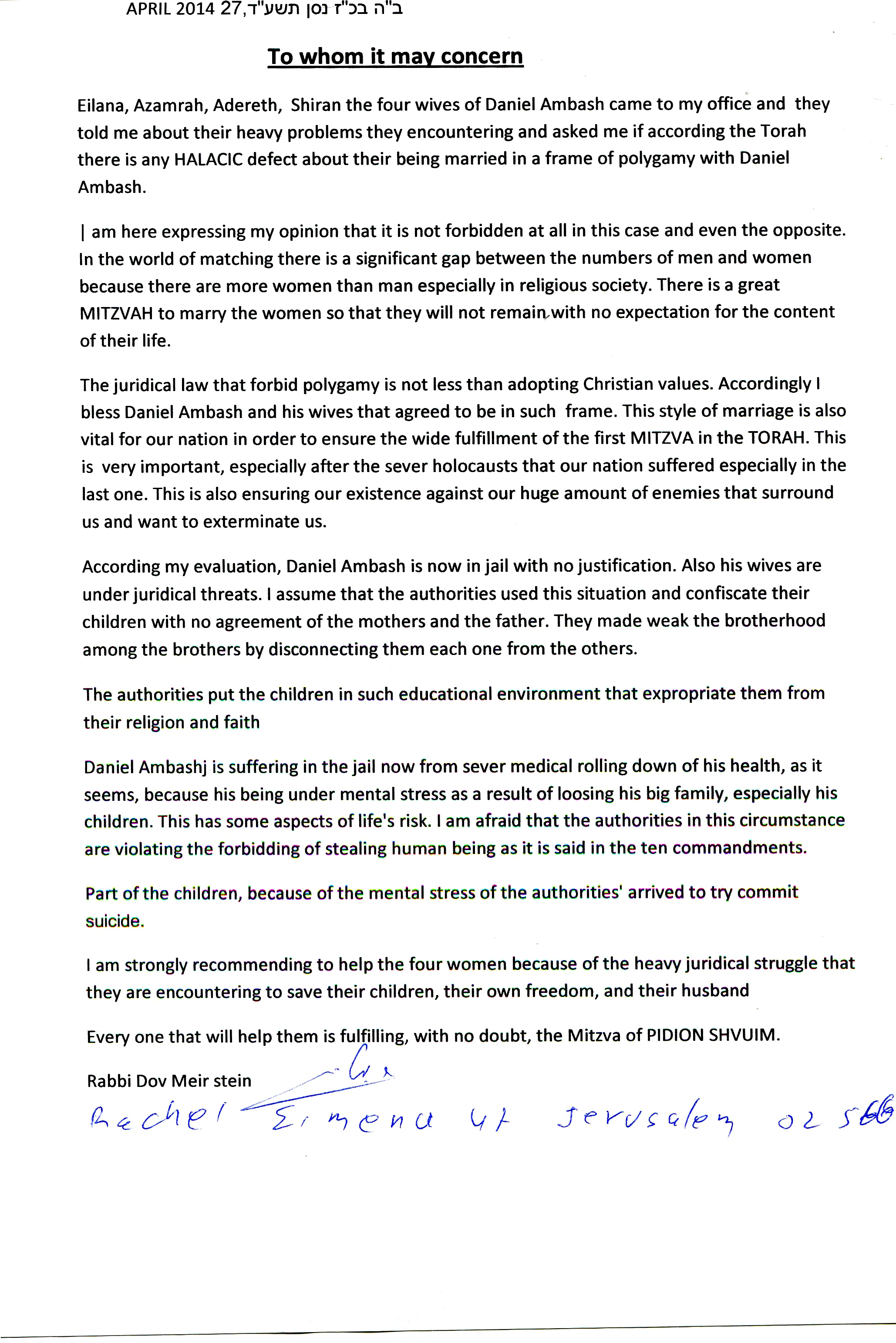 At some point, Daniel experienced a Jewish reawakening and began to study in a French yeshiva. He divorced his first wife, who was not Jewish, and married Ilana, who comes from a French-Sefardic family. Shortly thereafter he met Rabbi Odesser, who had come to France to publicize the Letter From Heaven he received from Rabbi Nachman of Breslov. Daniel was very taken with Rabbi Odesser’s message and quickly became a devoted follower. Soon he moved his young family back to Israel , the land of his birth. I met Daniel, along with many other recent French Olim (Jewish immigrants to Israel ), in the Aliyah Center in Mevasseret Tzion outside of Jerusalem . Rabbi Odesser would stay with different families in this center, and when I came to see him I met his young French hosts too. I was immediately taken by all the French Jewish families I met, and especially by Daniel. In my experience as a participant in the Na Nach movement over a seven year period, I found almost all the Na Nachs, whether native Israeli, or French or American Olim, to be brilliant and creative people, deeply passionate about their beliefs and deeply committed to the cause of publicizing Rabbi Odesser’s “Petek” to the world. But of all the wonderful people I met, none surpassed Daniel Ambash in creative brilliance. Besides being a dancer, Daniel was a talented painter. He taught himself Jewish scribal arts and also became adept at various kinds of computer software that he utilized in a publishing operation. He was a brilliant Torah student and deeply familiar with the voluminous writings of Rabbi Nachman of Breslov. Daniel mastered pretty much whatever he put his mind to. He also was a deeply compassionate person, warm and friendly, who loved to have guests in his home for Shabbat. He also had a sharp and ironic sense of humor. Once, for example, when we were visiting Rabbi Odesser’s grave in Jerusalem , Daniel quipped, upon seeing a group of very scantily clad women in the cemetery: “Maybe they are trying to help raise the dead from their graves.” His wife, Ilana, was supportive of all his endeavors, as well as a very efficient homemaker raising a large and growing family. They also had Rabbi Odesser as a guest in their apartment for frequent long stays, which imposed no small hardship on their family but which they accepted cheerfully. In short, Daniel and Ilana struck me as an ideal couple with an ideal family life. When Ilana told me that she thought Daniel should marry Esther, I knew she was right. I was troubled and hurt, simply because of the horrible awkwardness of surrendering one’s wife to one’s friend. But still I knew it was best for all parties involved. And even though afterwards Daniel continued to be friendly to me, I never was able to visit his home again due to my sense of shame about the whole matter. The last time I saw Daniel was at the Arizal mikveh in 1999. He was friendly and told me that I was always welcome to visit his family. But I never again saw him or stepped inside his home. During the past 12 years that I have been away from Israel , I have had frequent dreams about Daniel and his family. I know that his unconventional lifestyle has provoked much controversy in Israel , as well as a police investigation. It is my prayer that by providing this background information, along with an English translation of the transcript of a recent very favorable Israeli TV news report about his family, this will somehow vindicate in the eyes of the public the reputation of a former close friend and colleague in the Na Nach Breslov Chassidic movement. Sincerely Michael Korn PS Daniel once told me that, because his mother is Sefardic, according to Halacha he is permitted to marry more than one wife, because the Sefardim never accepted the decree of Rabbeinu Gershon, about 1000 years ago, banning polygamous marriage for European Jewry. And although it is not common for Sefardic Jews to have multiple wives, some Sefardim have practiced this, including the famous rabbi Baba Sali. And on a personal note, in an age of rampant divorce, shattered families, and neglected and abandoned children, I find it both ironic and repugnant that anyone would criticize the loving and harmonious family unit that Daniel and Ilana Ambash have endeavored, with the help of God, to create. Let he who is without sin cast the first stone at them. PPS See a similar case of Mormon polygamist Tom Green, who was arrested and his family of six wives and thirty children left destitute.
